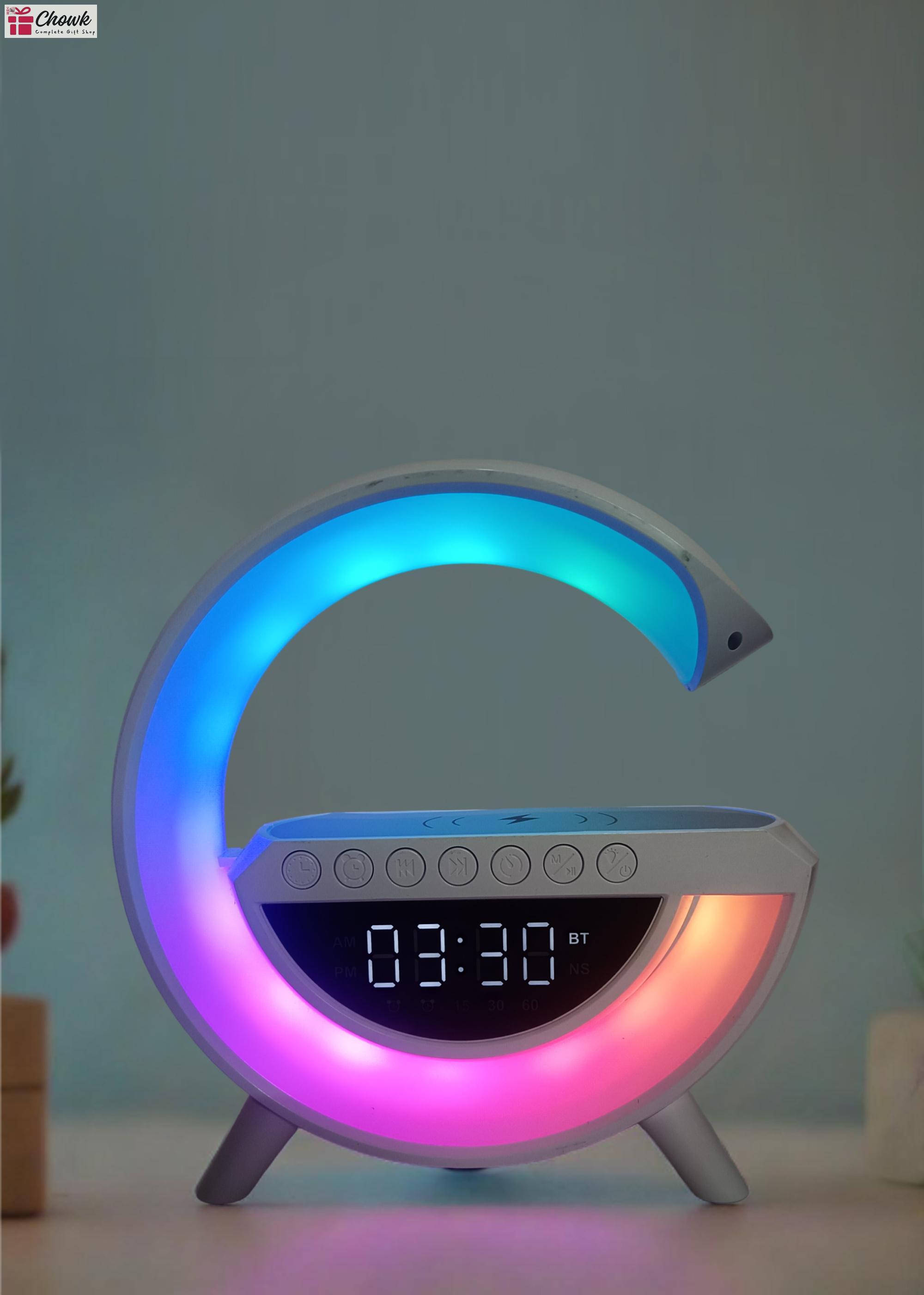 Elevate your audio experience with our G Shape Bluetooth Speaker featuring wireless charging, FM radio, AM radio, and multi-color LED lights. Order now and immerse yourself in the ultimate entertainment hub!
